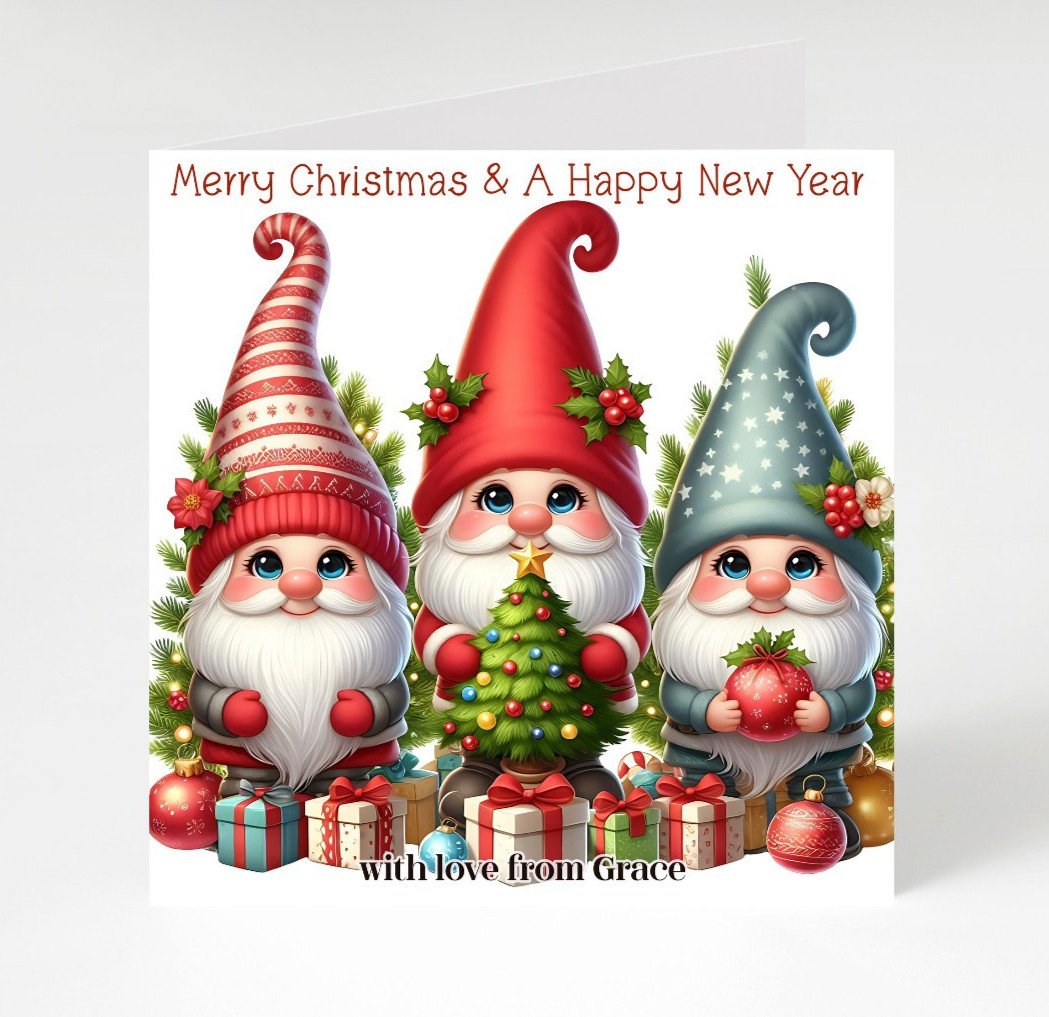 Personalised Gnomes Merry Christmas & a Happy New Year cards pack of 8