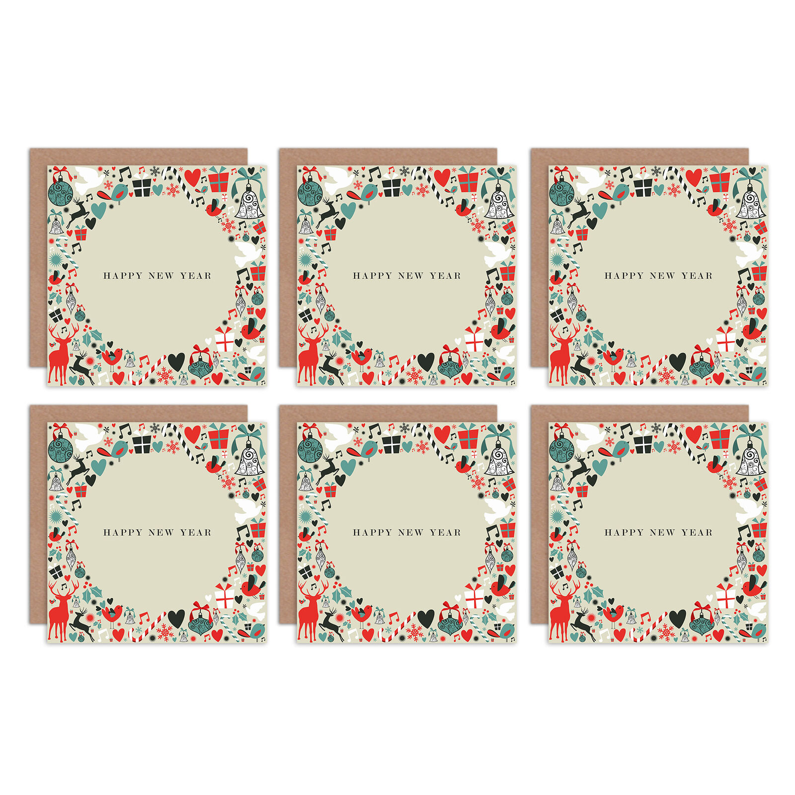 Happy New Year Christmas Holiday Circle Blank Greeting Cards w/ Envelopes 6 Pack