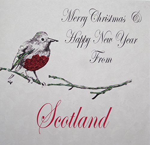 white cotton cards Merry Happy New Year, Handmade Christmas Card (Town Scotland, Robin)