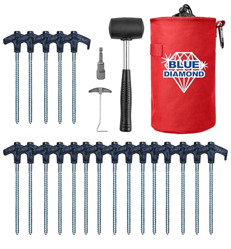 Blue Diamond Heavy Duty Screw Tent Pegs - Pack of 20 | Hard Ground Tent Pegs, Camping Pegs | Rustproof Galvanized Steel (Deluxe Kit (Mallet, Peg Puller, Drill-Adaptor, Carry Bag))