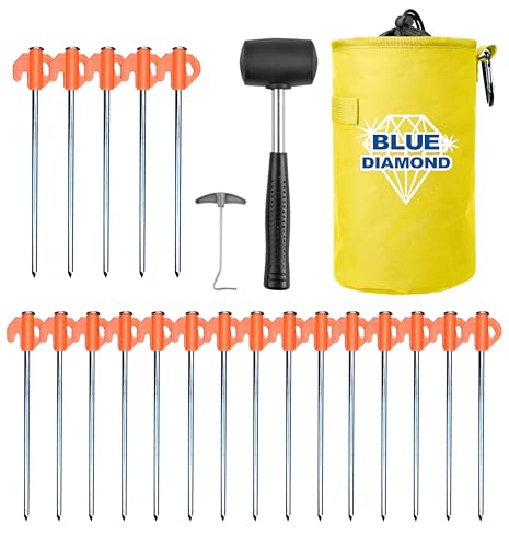 Blue Diamond Heavy Duty Tent Pegs - 20 Pack Hard Ground Tent Pegs, Camping Pegs for Awnings, Gazebos, Outdoor Use - Galvanized Steel (Deluxe Kit (Mallet, Peg Puller, Carry Bag))