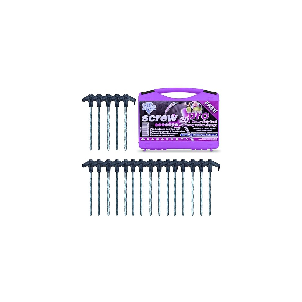Blue Diamond Heavy Duty Screw Tent Pegs - Pack of 20 | Hard Ground Tent Pegs, Camping Pegs | Rustproof Galvanized Steel (Carry Case)
