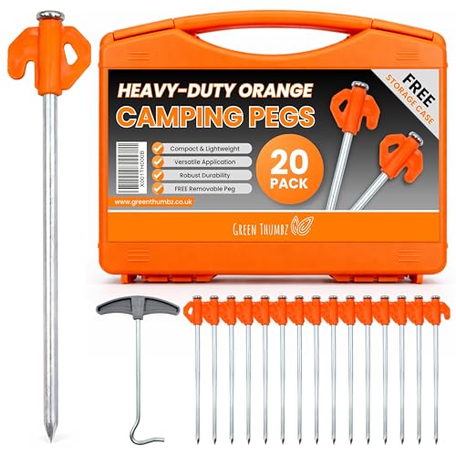Heavy Duty Tent Pegs - 20cm x 20 Pack Orange Hard Ground Tent Pegs, Camping Pegs, Awning Peg for outdoors, Strong Galvanized Steel with Storage Case and Peg Remover