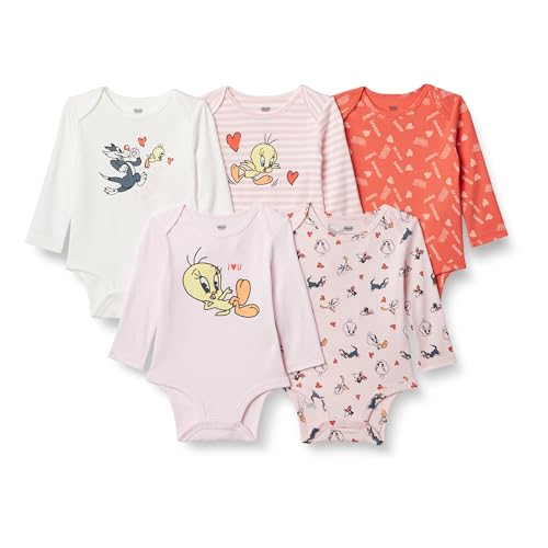 Amazon Essentials Harry Potter - DC Comics - Looney Tunes Unisex Babies' Long-Sleeve Bodysuits, Baby Vests, Pack of 5, Tweety Love, 6-9 Months