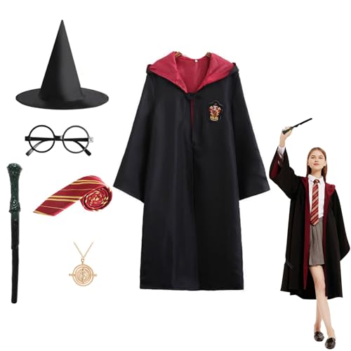 BYYDANFC 6 Pcs Wizard Cloak Magic Robe Costume, Wizard Costume for Harry Potter Costume, Cosplay Set With Wizard Tie Glasses Frame Hat Magic Wand For Carnival Halloween Cosplay Party