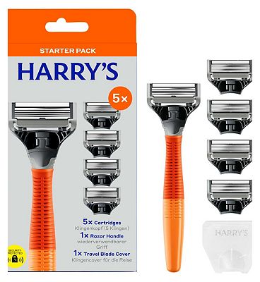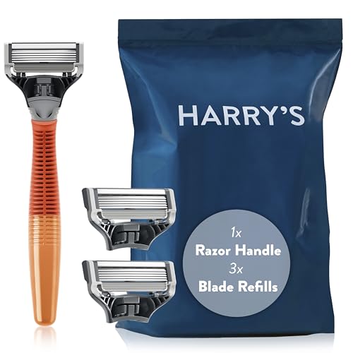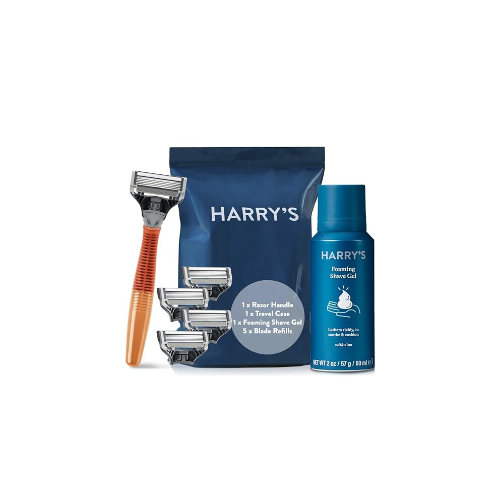 Harry's Razors for Men - Men's Razor Set with Bright Orange Handle, 5 Razor Blade Refills, Travel Blade Cover, 60ml Shave Gel