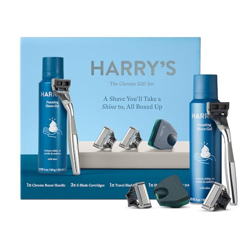 Harry's Original Chrome Razor Gift Set, Includes Gift Box, Weighted Handle, 3 Cartridge Refills, Travel Cover, and Shave Gel