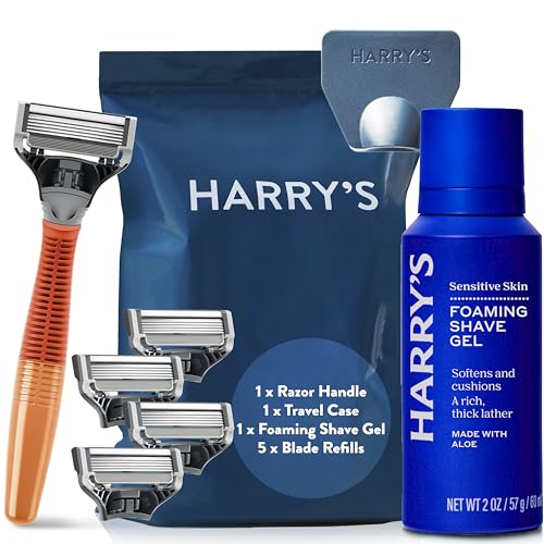 Harry's Razors for Men - Men's Razor Set with Bright Orange Handle, 5 Razor Blade Refills, Travel Blade Cover, 60ml Shave Gel