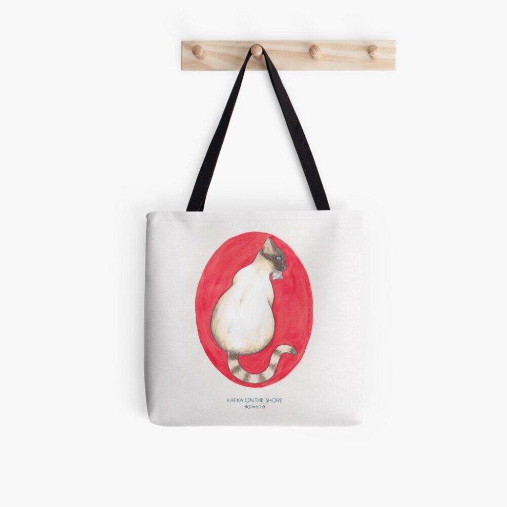 Tote Bags Haruki Murakami's Kafka on the Shore a Siamese Cat with a Fish in her Mouth in Pencil and Watercolour Grocery for School Library Gym