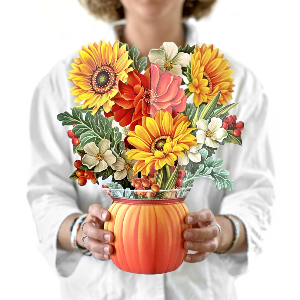 Freshcut Paper Pop Up Cards, Thanksgiving Greeting Cards, Autumn, Fall, Pumpkin Harvest, 12 inch Life Sized Forever Flower Bouquet 3D Popup with Note