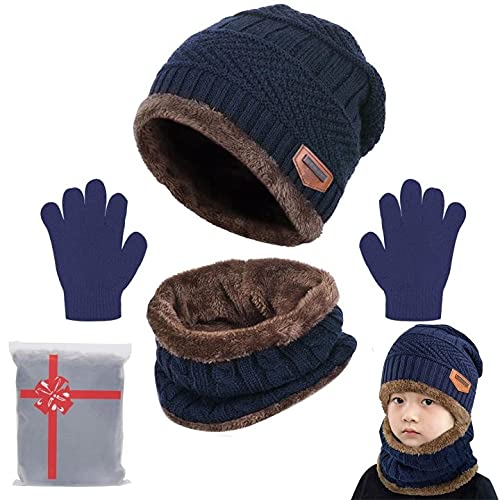CheChury Kids Knitted Beanie Hat Circle Scarf and Gloves Set Super Soft Fleece Inner Lining Warm Hat Neck Warmer and Gloves Set for Outdoor 3-11 Years old,A-Black,One size