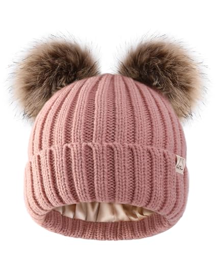 Hat Hut Satin Lined Beanie for Baby Winter Hats for Kids Toddler Double Bobble Hat Pom Pom Beanie for Boys Girls (B3-Pink 2 Poms)