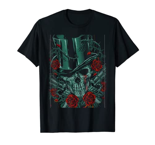 Skeleton Skull Red Rose Guns Top Hat T-Shirt