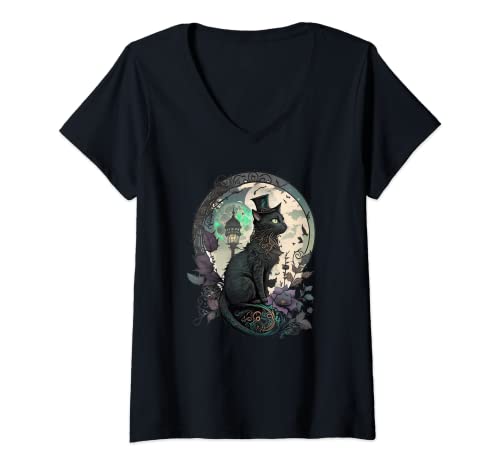 Womens Victorian Steampunk Black Cat Wearing a Top Hat V-Neck T-Shirt