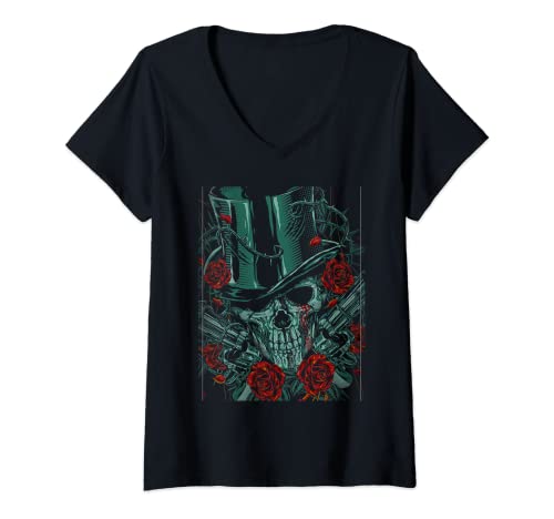 Womens Skeleton Skull Red Rose Guns Top Hat V-Neck T-Shirt