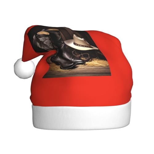 JKASDTRP Christmas Santa Hat For Adults, Soft Plush Xmas Hats For Women Men, Cowboy Black Hat Western Boots Classic Claus Cap Funny Holiday Party Headwear New Year Festive Accessory