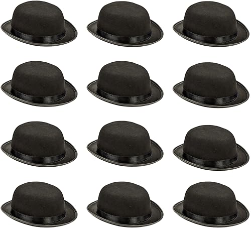 12 x Black Bowler Hats – Adults Fancy Dress Costume Accessories – Classic 1920s Hat for Men & Women – Soft Felt with Satin Band – Twenties, Dance, Victorian & Theatre Props – Unisex One Size Fits Most