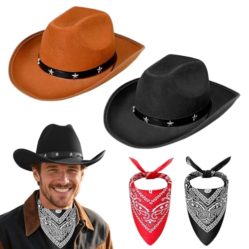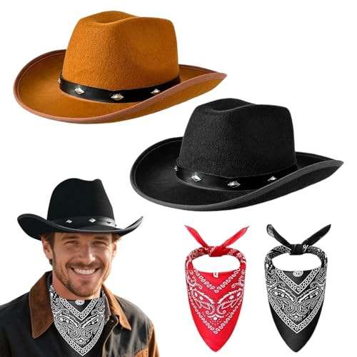 Meriviva Cowboy Hats for Men Women, 4Pcs Black and Brown Cowboy Hat with Bandana Accessories Set, Felt Western Hats for West Fancy Dress Party (Style B (black and brown hat set))