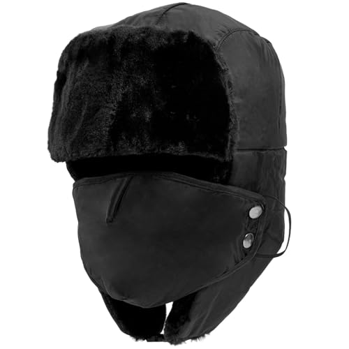 Zouwel Mens Hats and Caps, Ushanka Hat with Ear Flaps and Mask, Faux Fur Winter Warmer Windproof Bomber Hat for Skating, Skiing or Daily Use, Winter Hats for Men Women Black