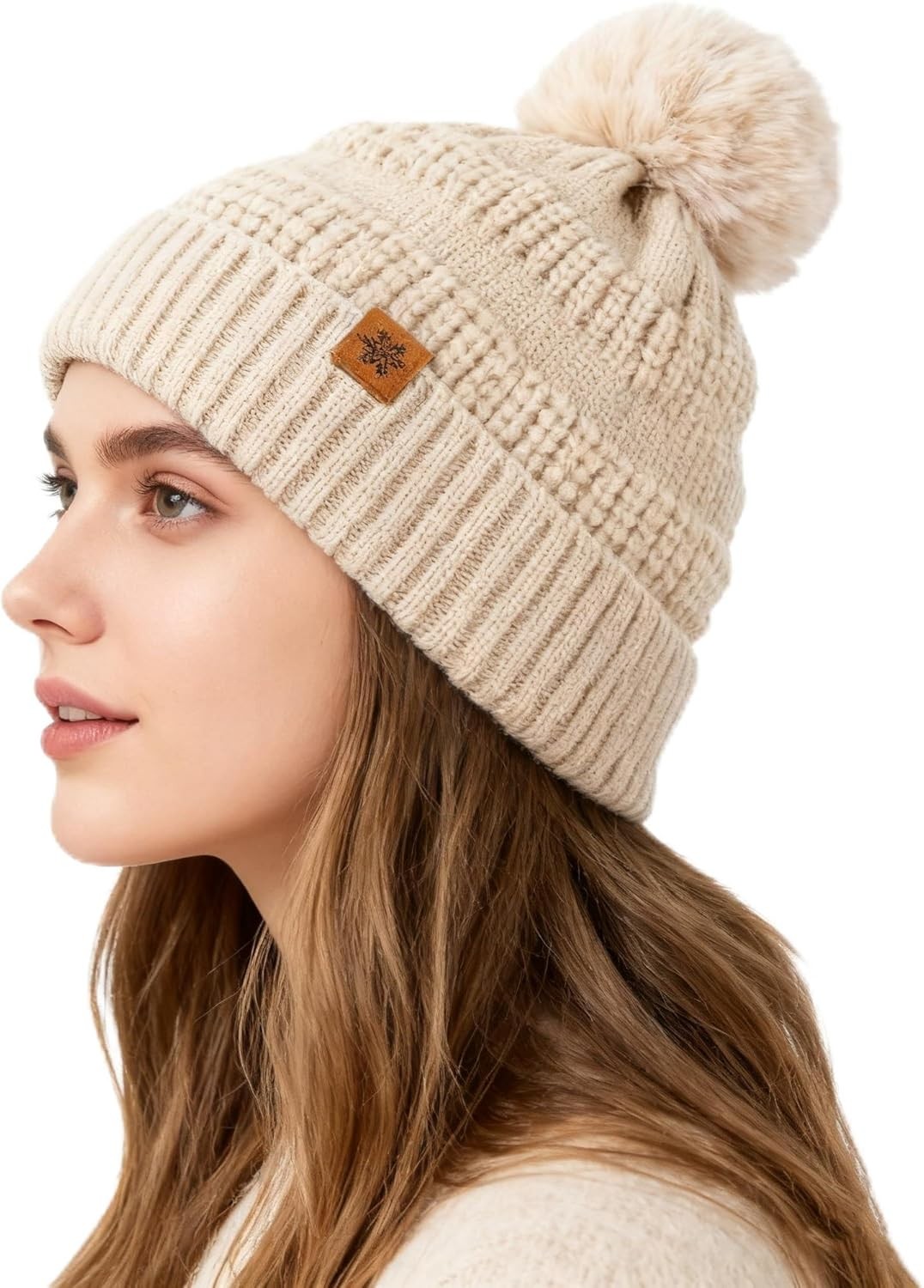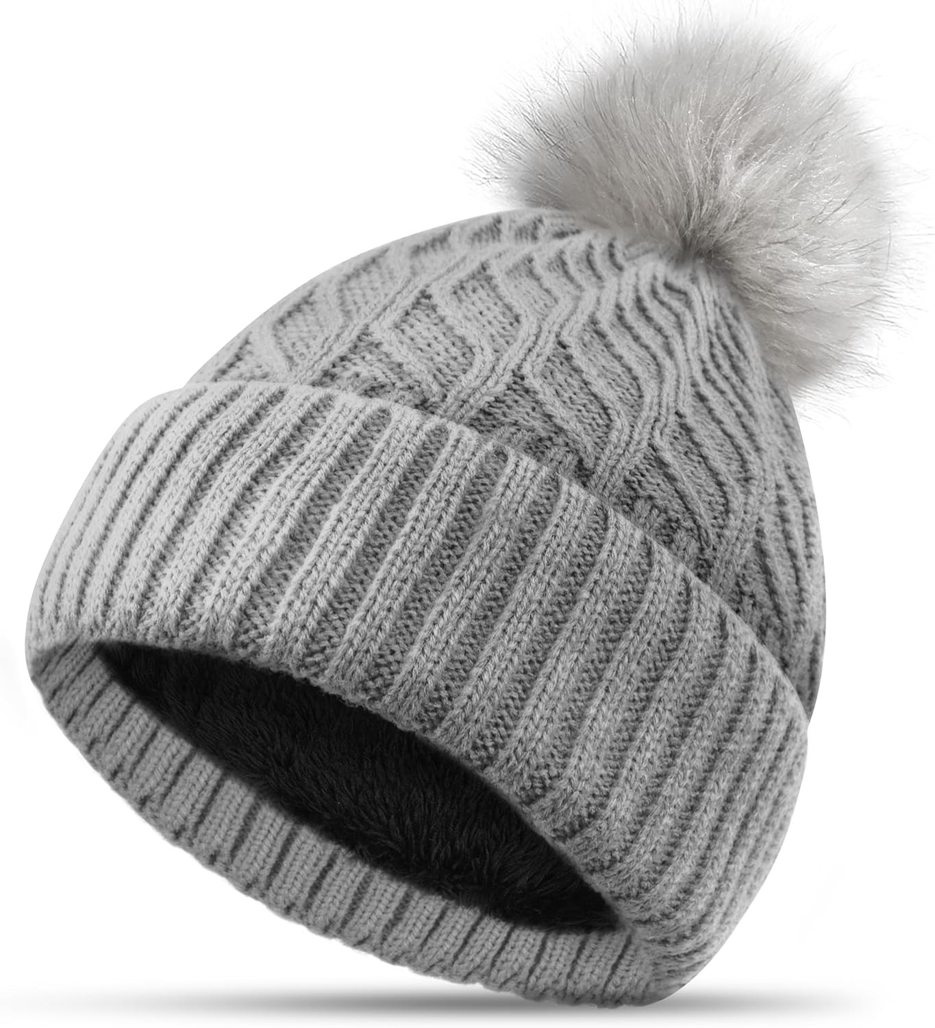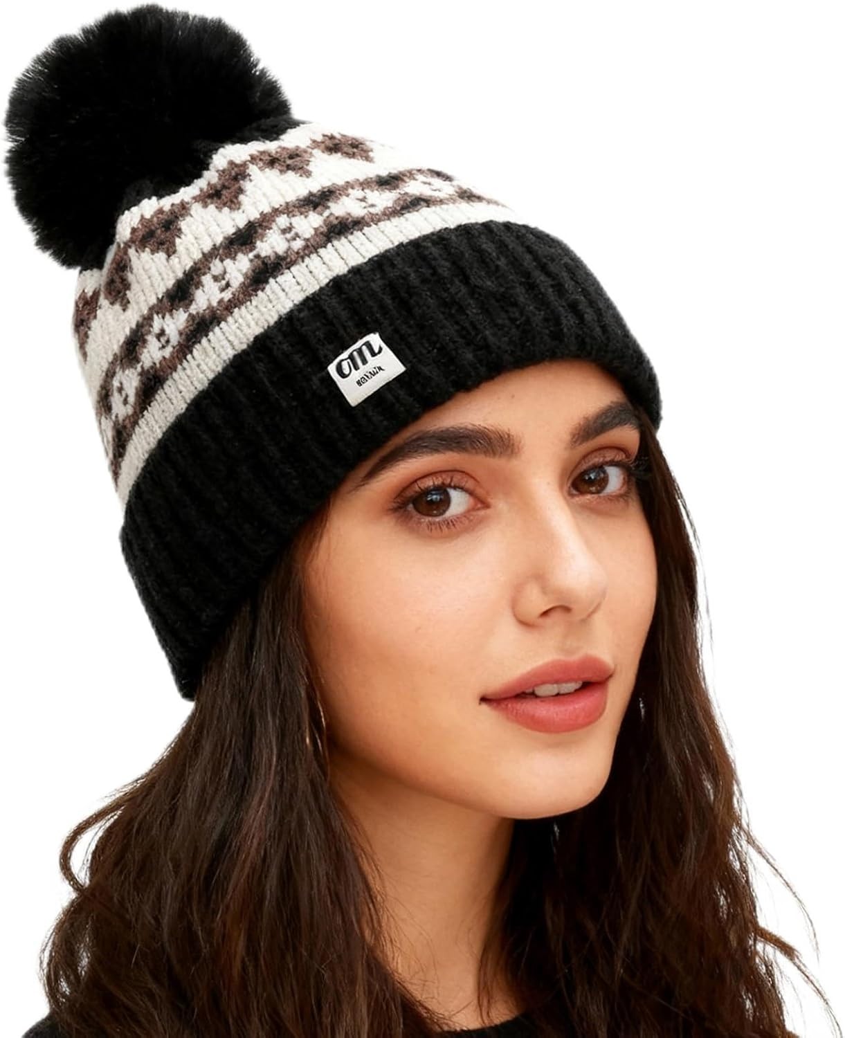FORVEVO Winter Hats for Women Bobble Hat Black Beanie Hats Double Fleece Layer Line with Pom Pom Wooly Hat Women
