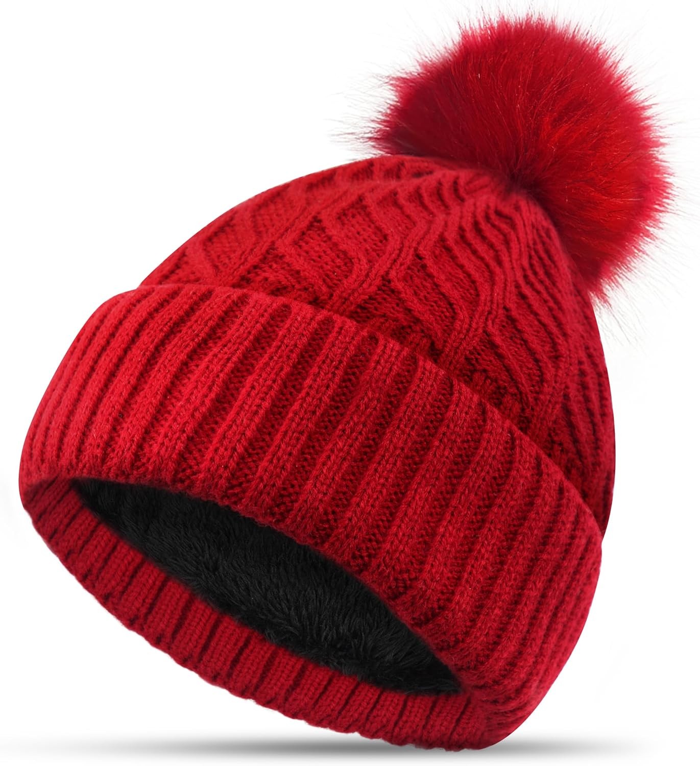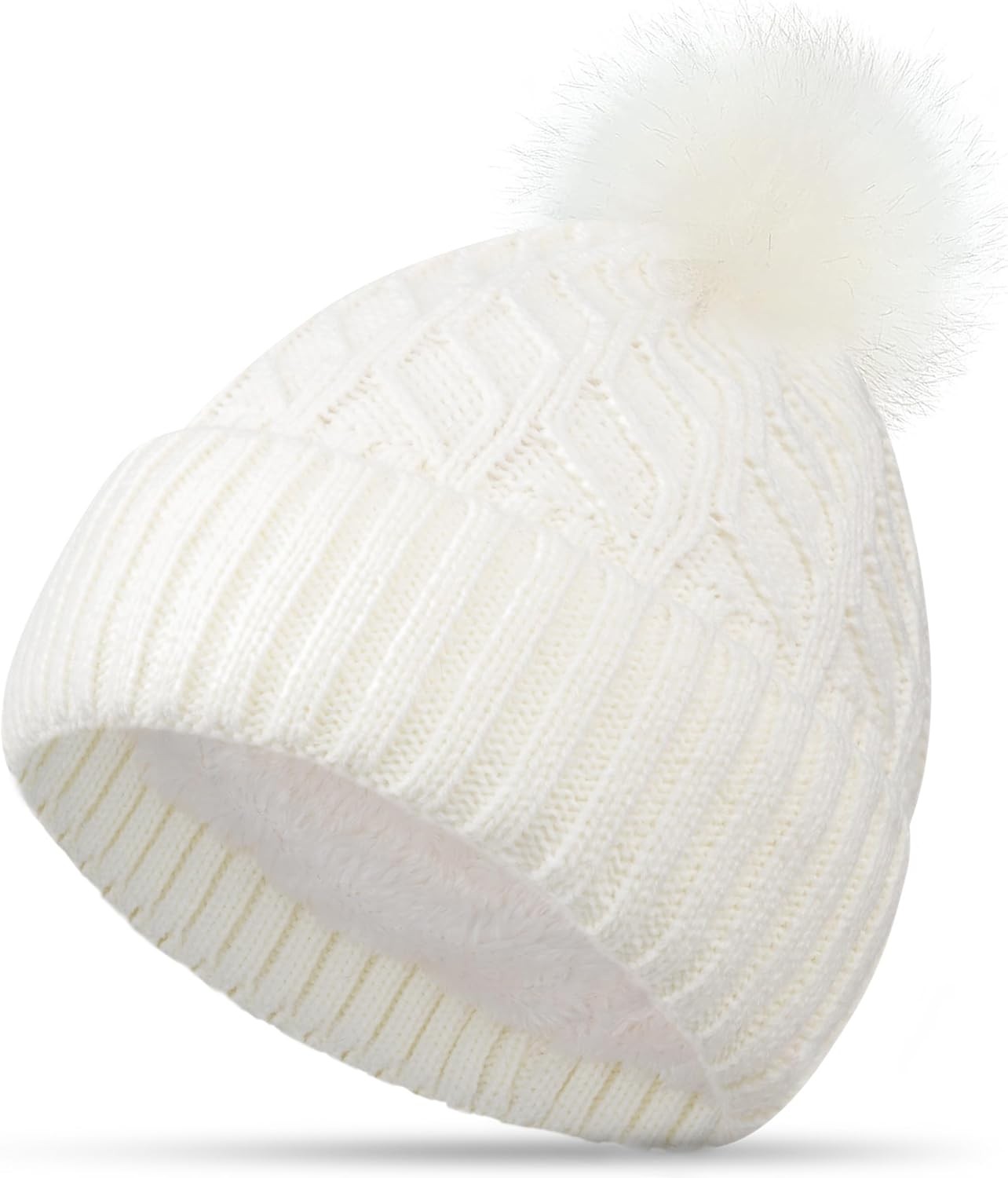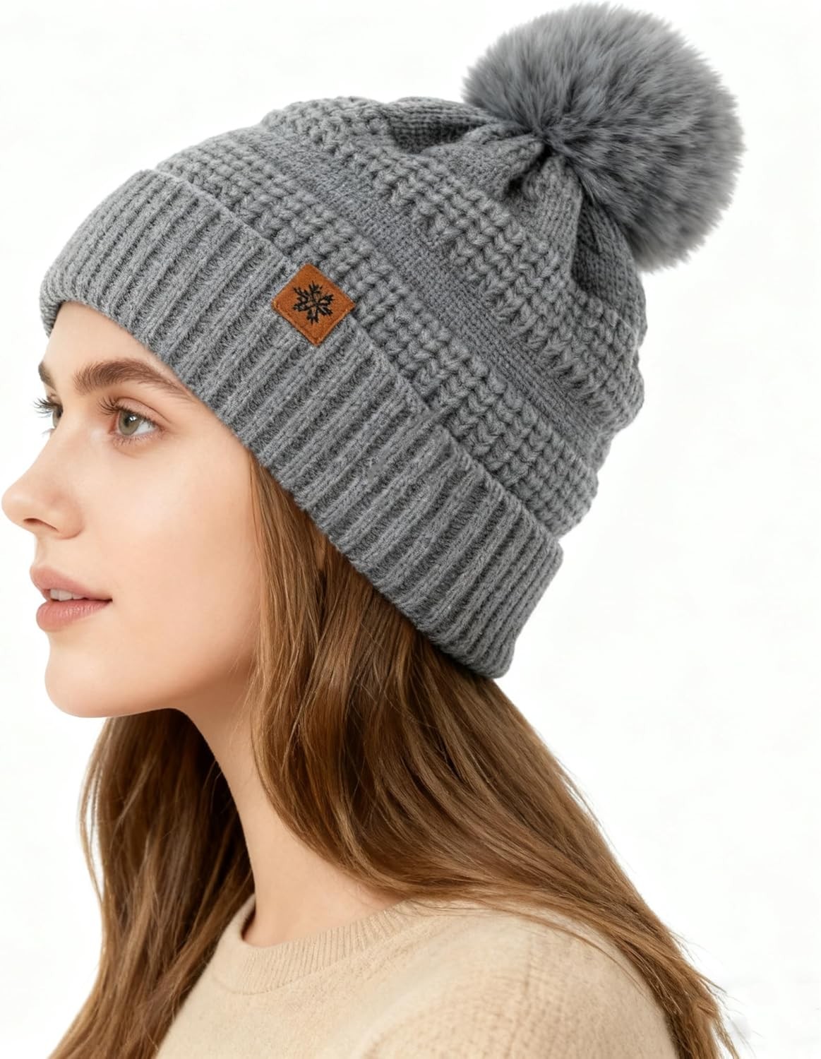 FORVEVO Winter Hats for Women Bobble Hat Black Beanie Hats Double Fleece Layer Line with Pom Pom Wooly Hat Women