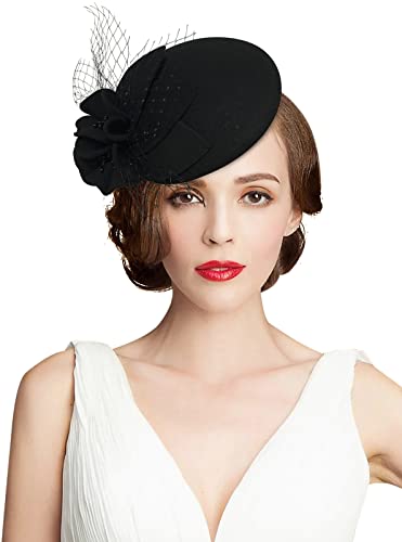 Z&X Vintage 1920s Wool Felt Flower Fascinator Pillbox Hat British Wedding Church Hats for Women Winter Fedoras Black