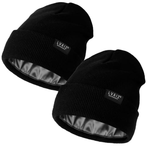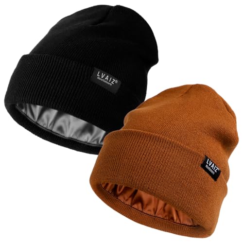 Lvaiz Hats 2 Pack Satin Lined Beanie Hats for Men Women Winter Warm Knitted Cuffed Silk Lined Slouchy Skull Cap, Black+Black, One Size