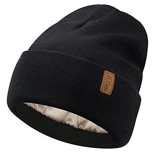 Bequemer Laden Womens Winter Warm Satin Lined Knit Beanie Hat Slouchy Skull Caps Silk Lining Ski Hats for Women Men, Black, One Size