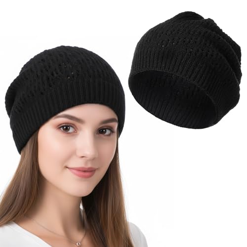 Abeillo Crochet Hat Fall Hats for Women, Lightweight Black Beanie Women Thin Crochet Beanie Hat for Winter Fall, Soft Mesh Slouchy Hand-Knitted Knit Hats