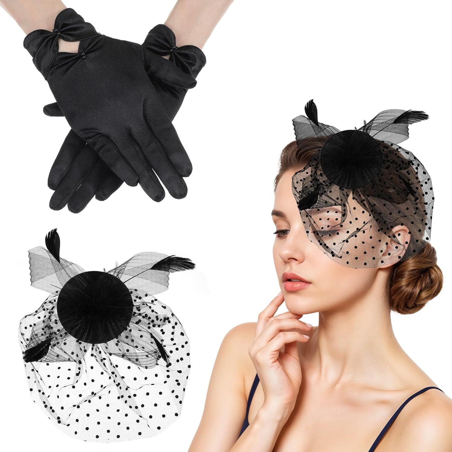 Grevosea Fascinators Hats for Women, Black Veil Tea Party Hat and Gloves 20s 50s Headpiece for Tea Party Outfits Wedding Accessories