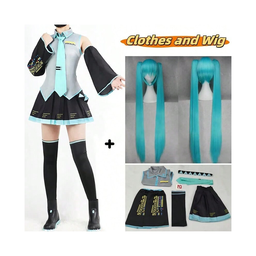 (M, With wig) Hatsune Miku Cosplay Japan Midi Dress Halloween Carnival Party Costume