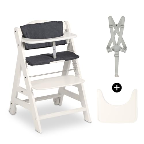 hauck Beta+, Whitewashed - Wooden High Chair Set from 6 Months to 90 kg - with Wheels, Seat Cushion, Wooden Tray & Bumper Bar, 5 Point Harness & Crotch Strap - Made from FSC Certified Beechwood