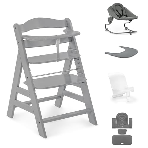 hauck Alpha+ Premium Bundle, Beech Grey - Wooden High Chair from Birth to 99 Years - Grow Along Highchair with Reclining Newborn Bouncer, Baby Seat Reducer, Seat Pad and Click On Tray
