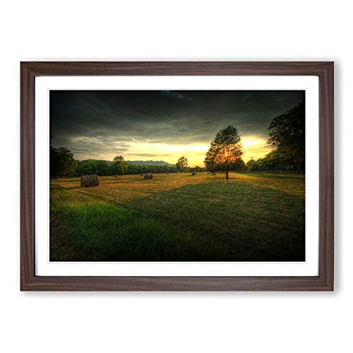 Big Box Art Landscape Tree and Hay Bales Framed Wall Art Picture Print Ready to Hang, Walnut A2 (62 x 45 cm)