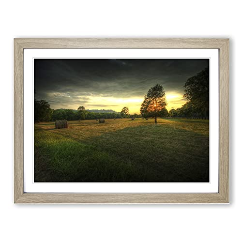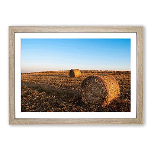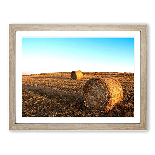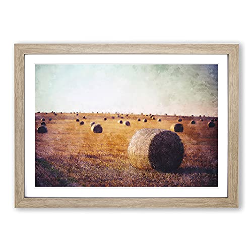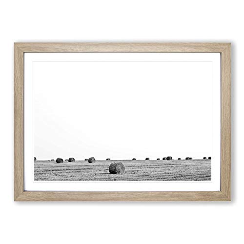 Landscape Hay Bales on a Field No.3 Modern Framed Wall Art Print, Ready to Hang Picture for Living Room Bedroom Home Office Décor, Oak A4 (34 x 25 cm)