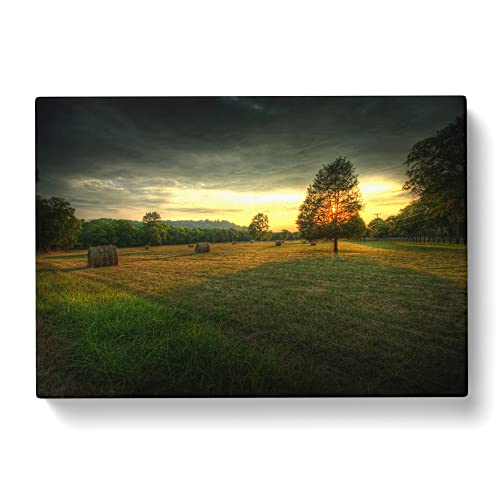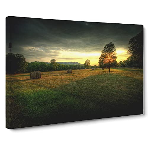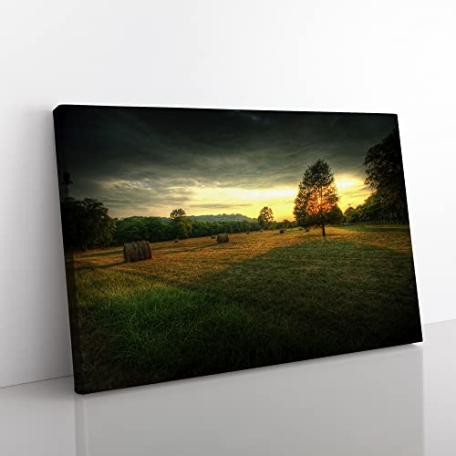 Landscape Tree and Hay Bales Modern Canvas Wall Art Print Ready to Hang, Framed Picture for Living Room Bedroom Home Office Décor, 76x50 cm (30x20 Inch)