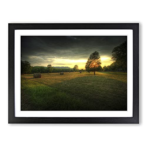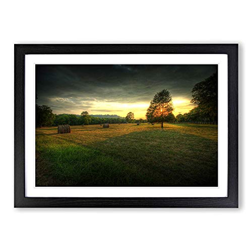 Big Box Art Landscape Tree and Hay Bales Framed Wall Art Picture Print Ready to Hang, Black A2 (62 x 45 cm)