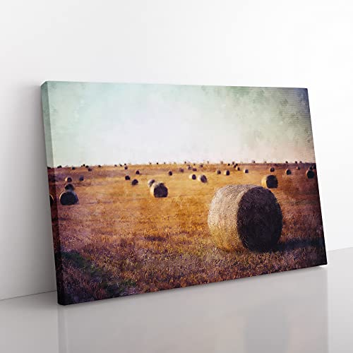 Landscape Hay Bales on a Field No.3 Modern Canvas Wall Art Print Ready to Hang, Framed Picture for Living Room Bedroom Home Office Décor, 76x50 cm (30x20 Inch)