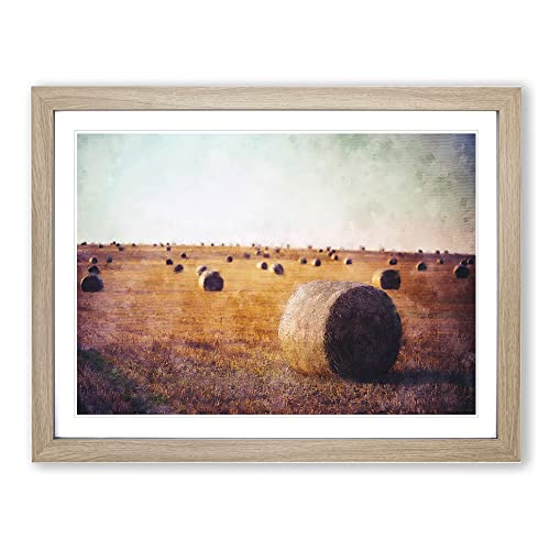 Landscape Hay Bales on a Field No.3 Modern Framed Wall Art Print, Ready to Hang Picture for Living Room Bedroom Home Office Décor, Oak A2 (64 x 46 cm)