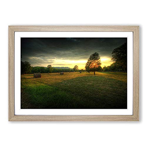 Big Box Art Landscape Tree and Hay Bales Framed Wall Art Picture Print Ready to Hang, Oak A2 (62 x 45 cm)