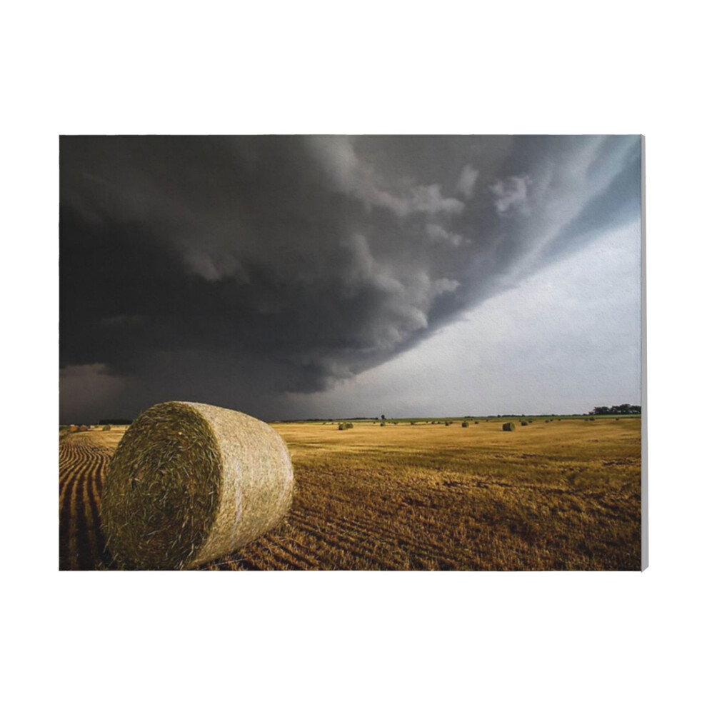 (Spinning Gold - Round Hay Bale And Storm In Kansas=2762) Canvas Print DIY Framed Kit Wall Art for Living Room Bedroom Retro Farmhouse Decor 16x20 inc