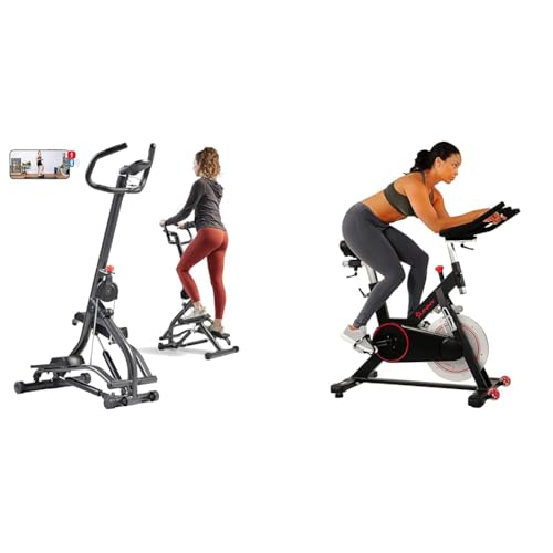 Sunny Health & Fitness Stair Stepper w/Handlebar, Extended Step Range Machine + Indoor Studio Cycle Pro Exercise Bike with 18 KG Flywheel and Chain Drive