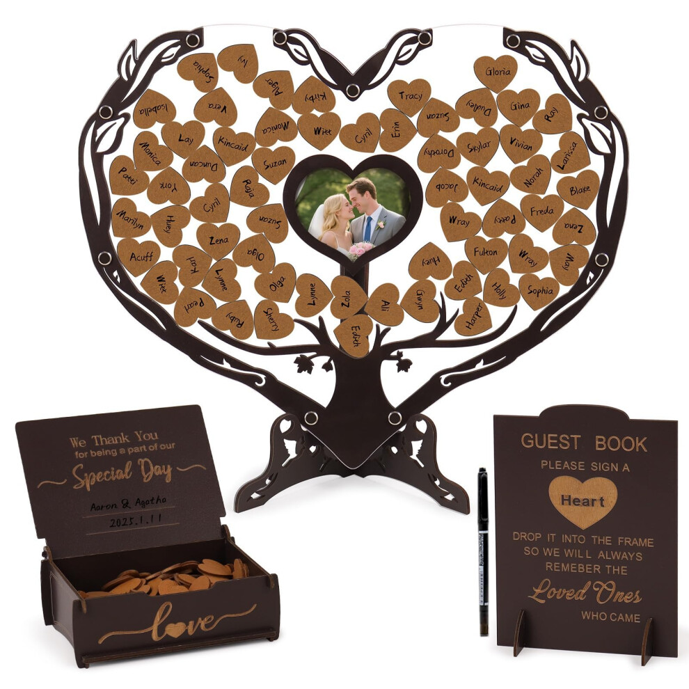 Heart Wedding Guest Book Alternative, Coffee Color Rustic Wooden Wedding Souvenirs with Heart Picture Frame, Heart Guest Book Drop Box, Personalized D