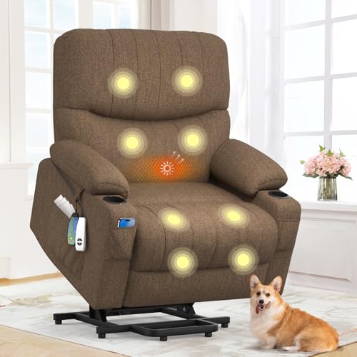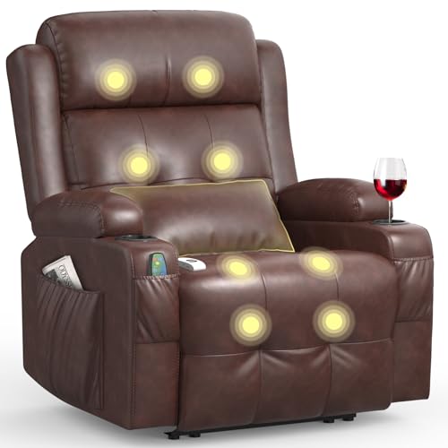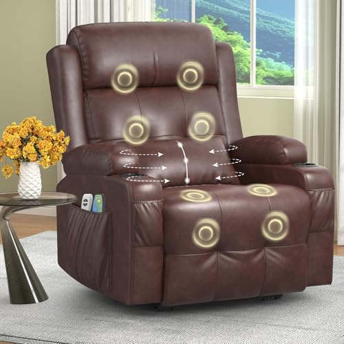 Large Power Lift Chair Recliners for Elderly,Recliner Chair with Massage & Heat,Extended Footrest,Heavy Duty Single Padded Seat Faux Leather Adjustable Reclining Armchair Upholstered Sofa Couch,Brown