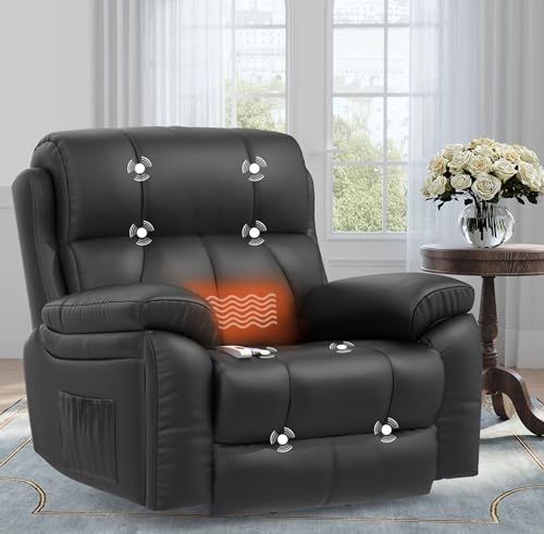 Bonnlo Chair Recliners, Recliner Chair with Massage & Heat, Oversized Recliners Armchair Lounge Sofa Adjustable Leg Rest, Side Pocket, for Home Living Room Theatre (Black PU)