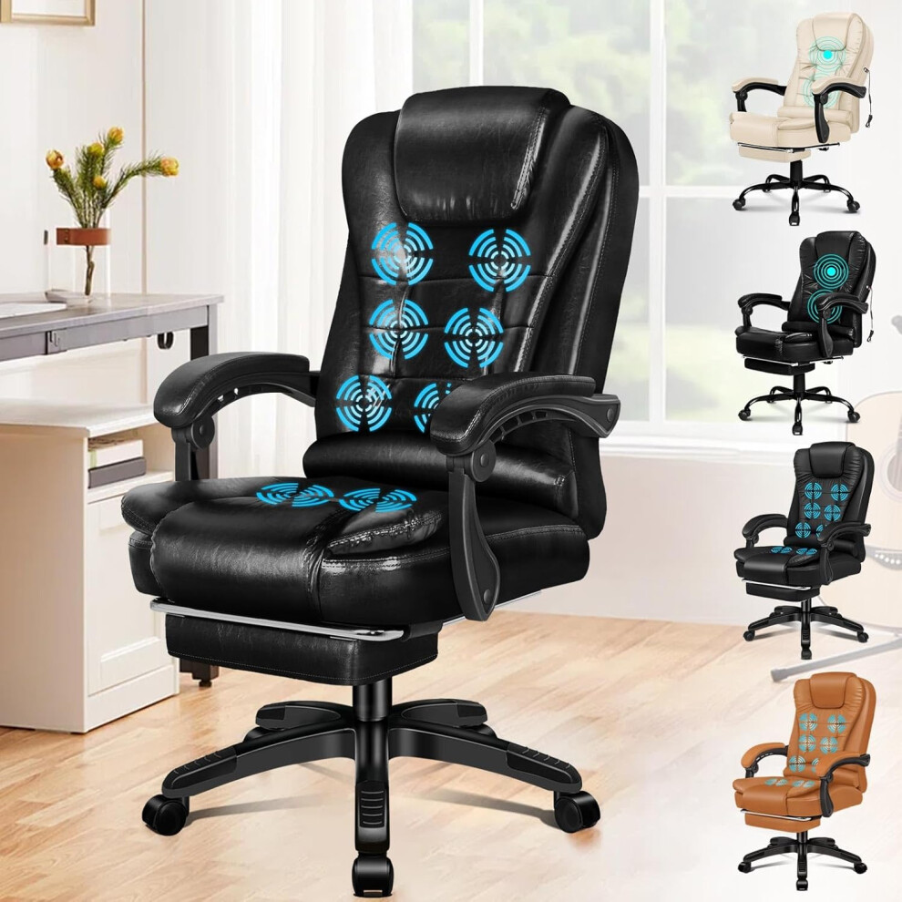 (Archie-black, 2-Point Massage) Office Chair with 8-point Massage Seat Heated, PC Desk Gaming Chair with Armrests Footrest High Back 150 Recliner Tilt