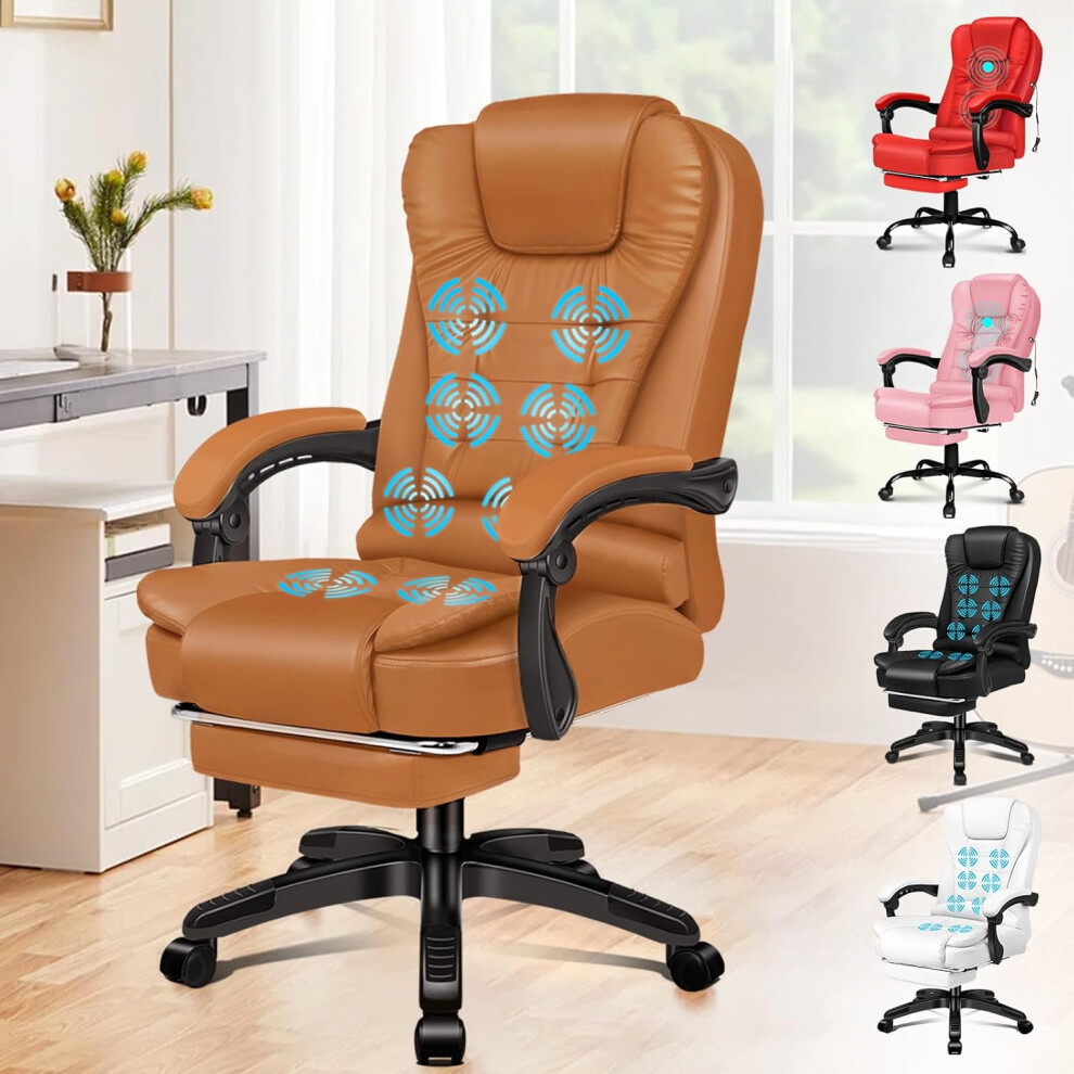 (Brown, 2-Point Massage) Office Chair with 8-point Massage Seat Heated, PC Desk Gaming Chair with Armrests Footrest High Back 150 Recliner Tilt Padded