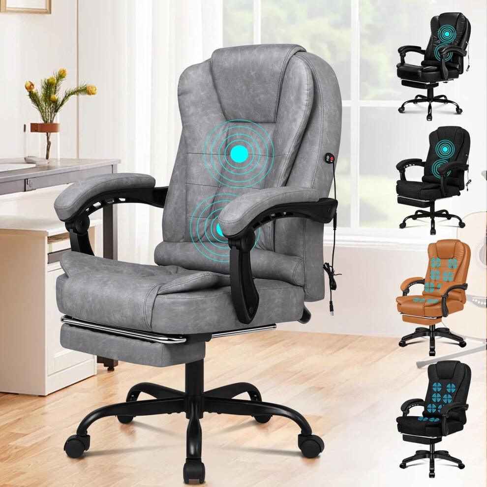 ELFORDSON Executive Office Chair with 8-point Massage Seat Heated, PC Desk Gaming Chair with Armrests Footrest High Back 150° Recliner Tilt Padded Swivel Fabric Linen, Grey