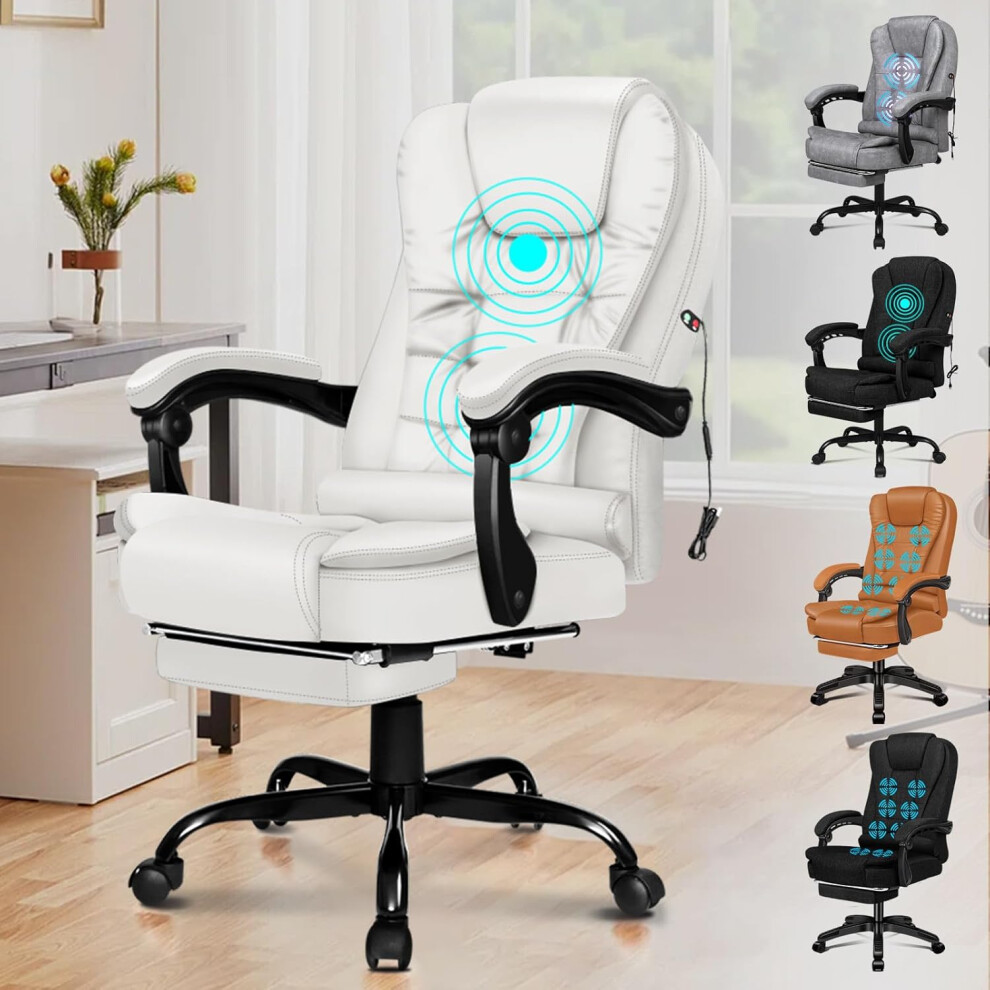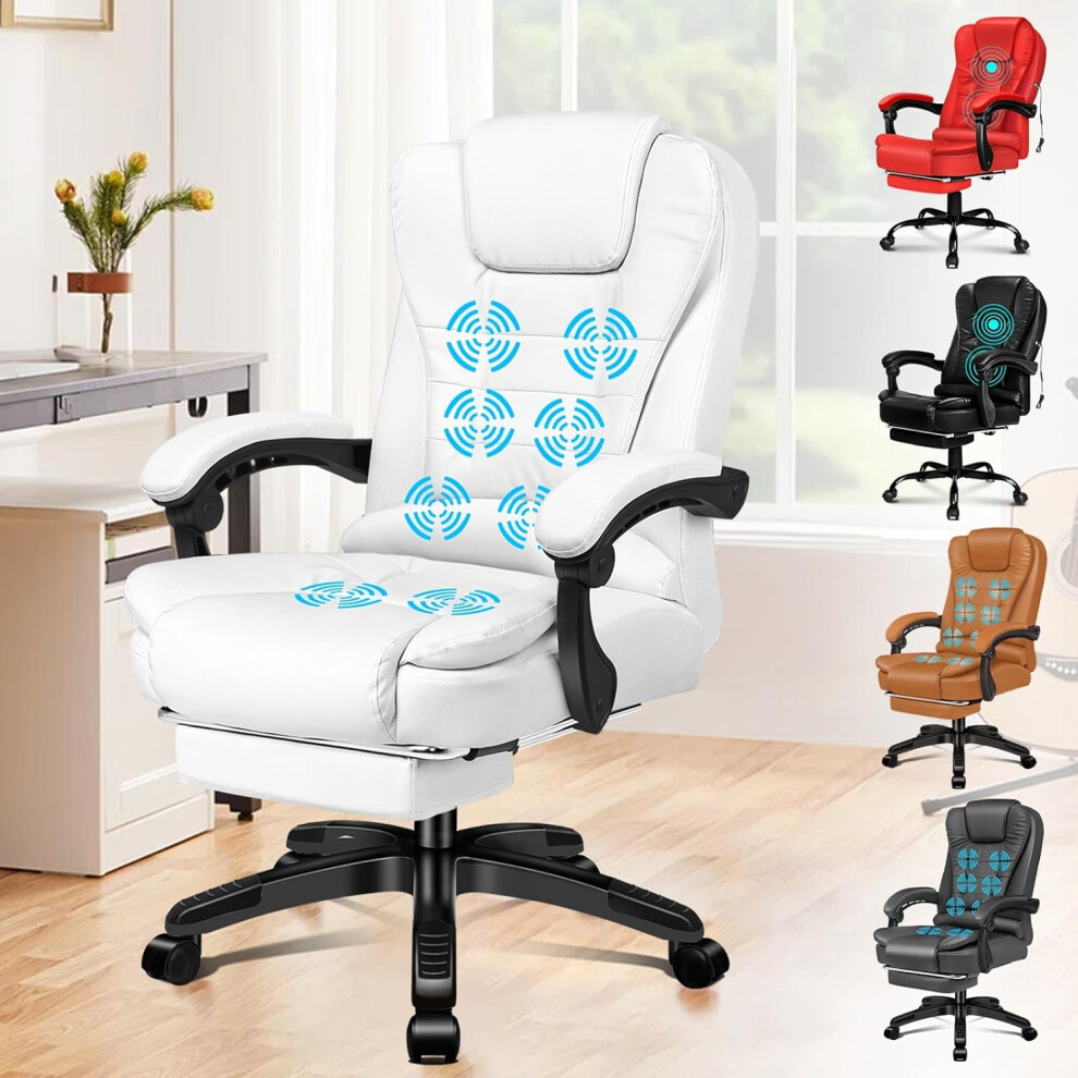 (White, 2-Point Massage) Office Chair with 8-point Massage Seat Heated, PC Desk Gaming Chair with Armrests Footrest High Back 150 Recliner Tilt Padded