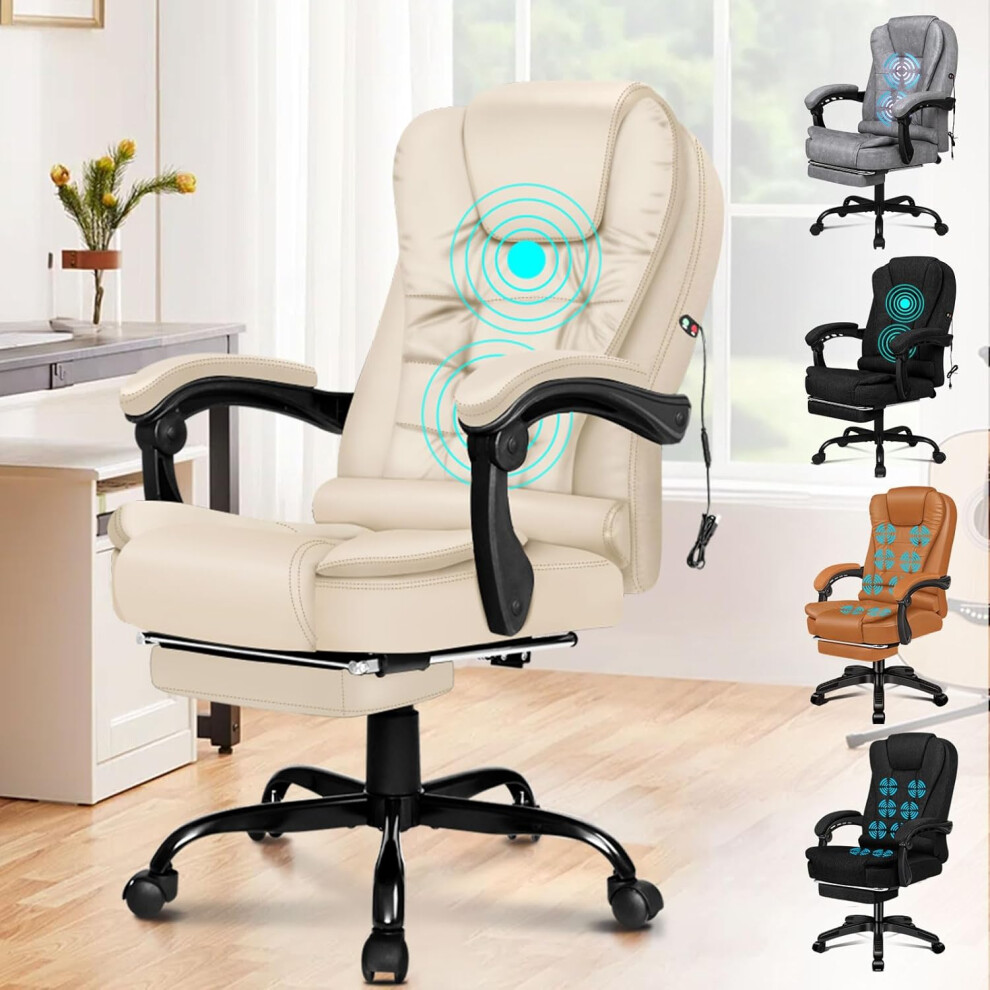 (Archie - Cream (Pu Leather), 2-Point Massage) Office Chair with 8-point Massage Seat Heated, PC Desk Gaming Chair with Armrests Footrest High Back 15